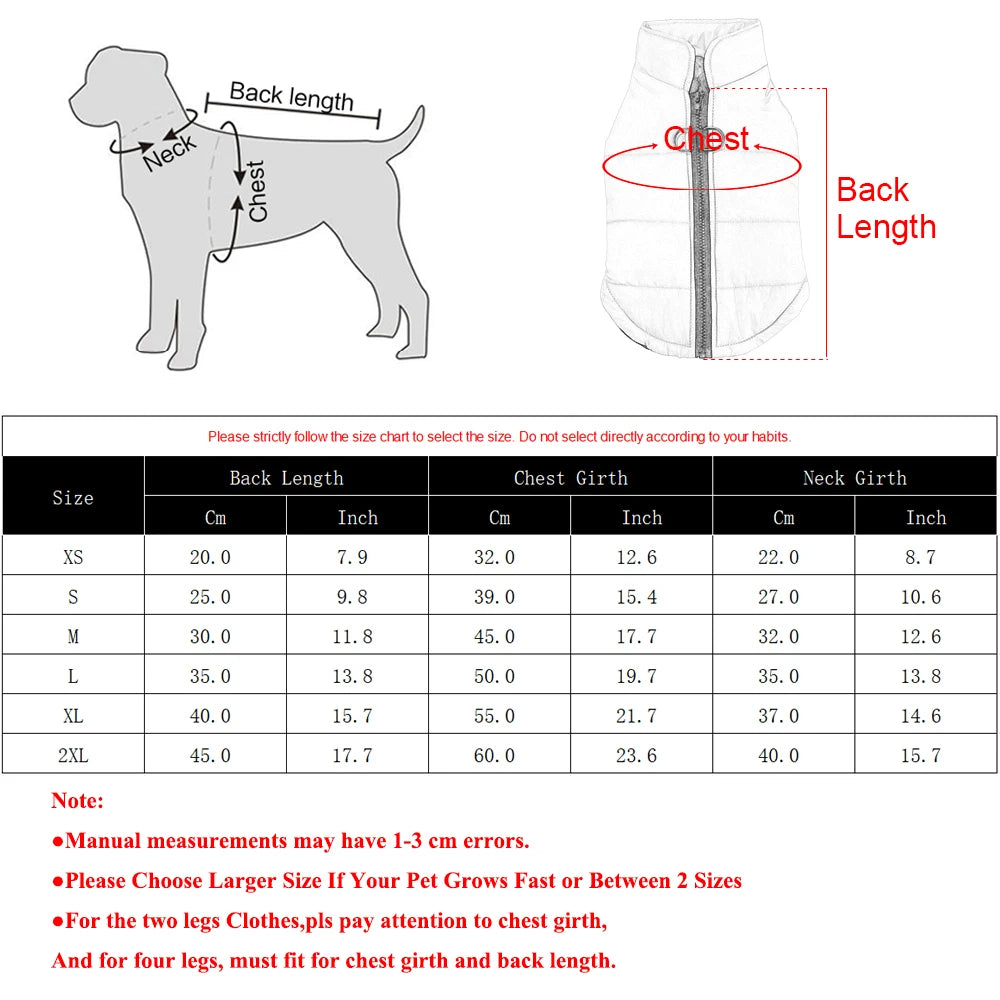 2.Please Choose Larger Size If Your Pet Grows Fast or Between 2 Sizes For the two legs Clothes,please pay attention to chest girth,And for four legs, must fit for chest girth and back length.